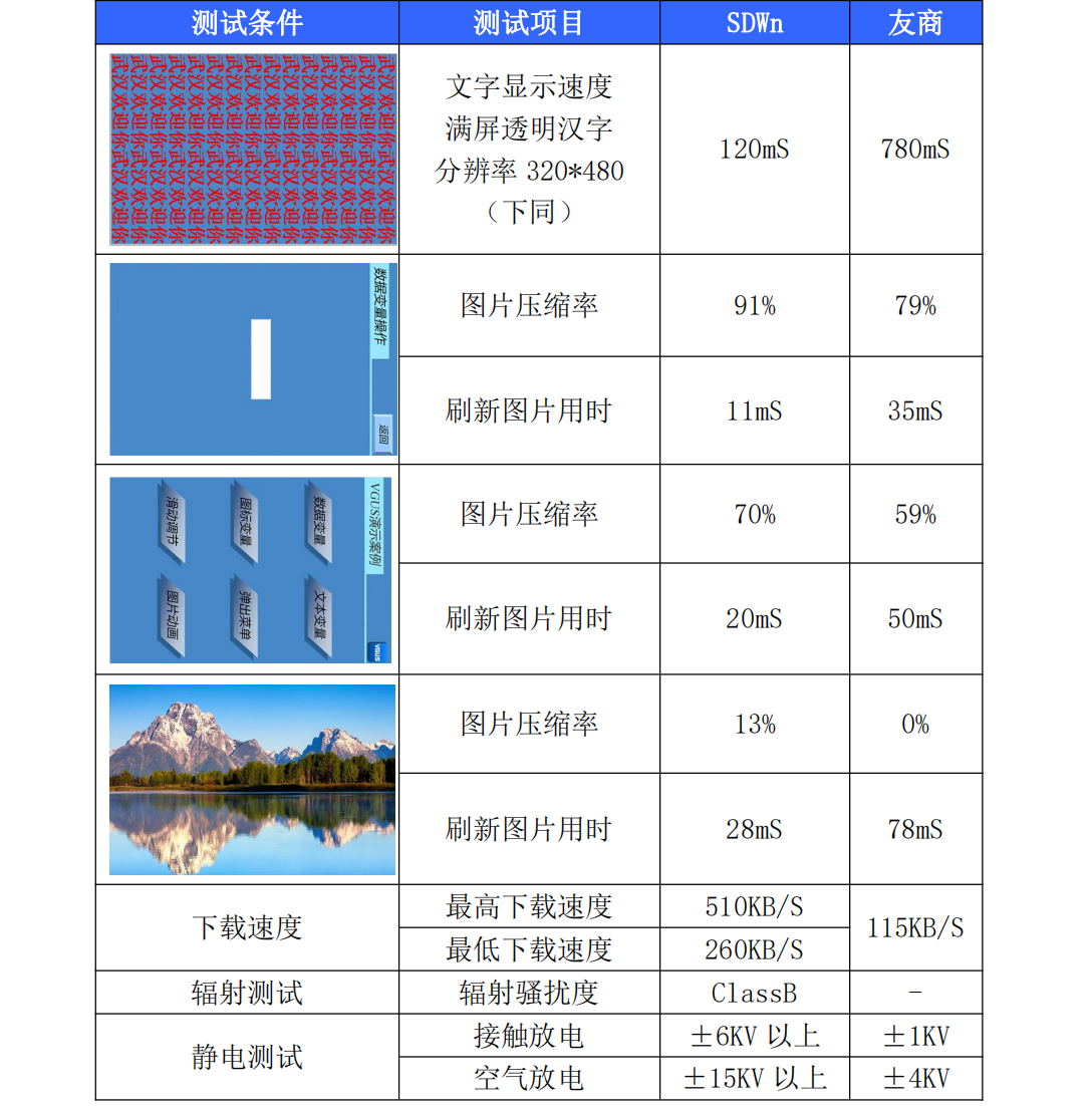 設(shè)計(jì)利用CPU并行機(jī)制讓讀寫flash數(shù)據(jù)和刷新屏幕數(shù)據(jù)同時(shí)進(jìn)行,極大的提高了顯示速度,讓刷屏痕跡的現(xiàn)象一去不復(fù)返。對(duì)于以簡(jiǎn)單純色為主的圖片,3.5寸屏刷屏?xí)r間僅需要10mS。而目前市場(chǎng)上類似方案的串口屏,3.5寸屏刷屏?xí)r間普遍都在50-100mS左右。
