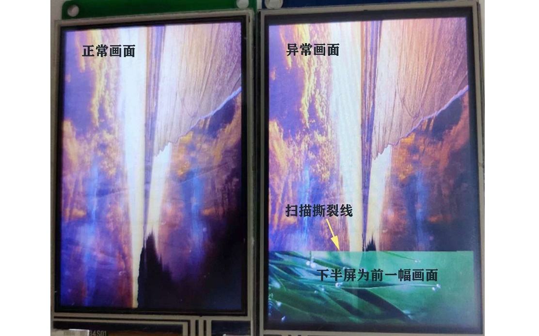 如果CPU刷屏速度不夠快,在切換畫面過程中,人眼會(huì)明顯看到畫面由上到下的變化,會(huì)在畫面上同時(shí)呈現(xiàn)前后兩幅畫面,在兩幅畫面交接的地方就會(huì)看到畫面被撕裂一樣的線條。由于3.5寸等小尺寸屏幕的像素顆粒大,使得畫面撕裂線非常明顯。目前市場(chǎng)上的3.5寸及以下串口屏,普遍都存在這種現(xiàn)象,特別是3.5寸320*480分辨率的串口屏最為嚴(yán)重。
